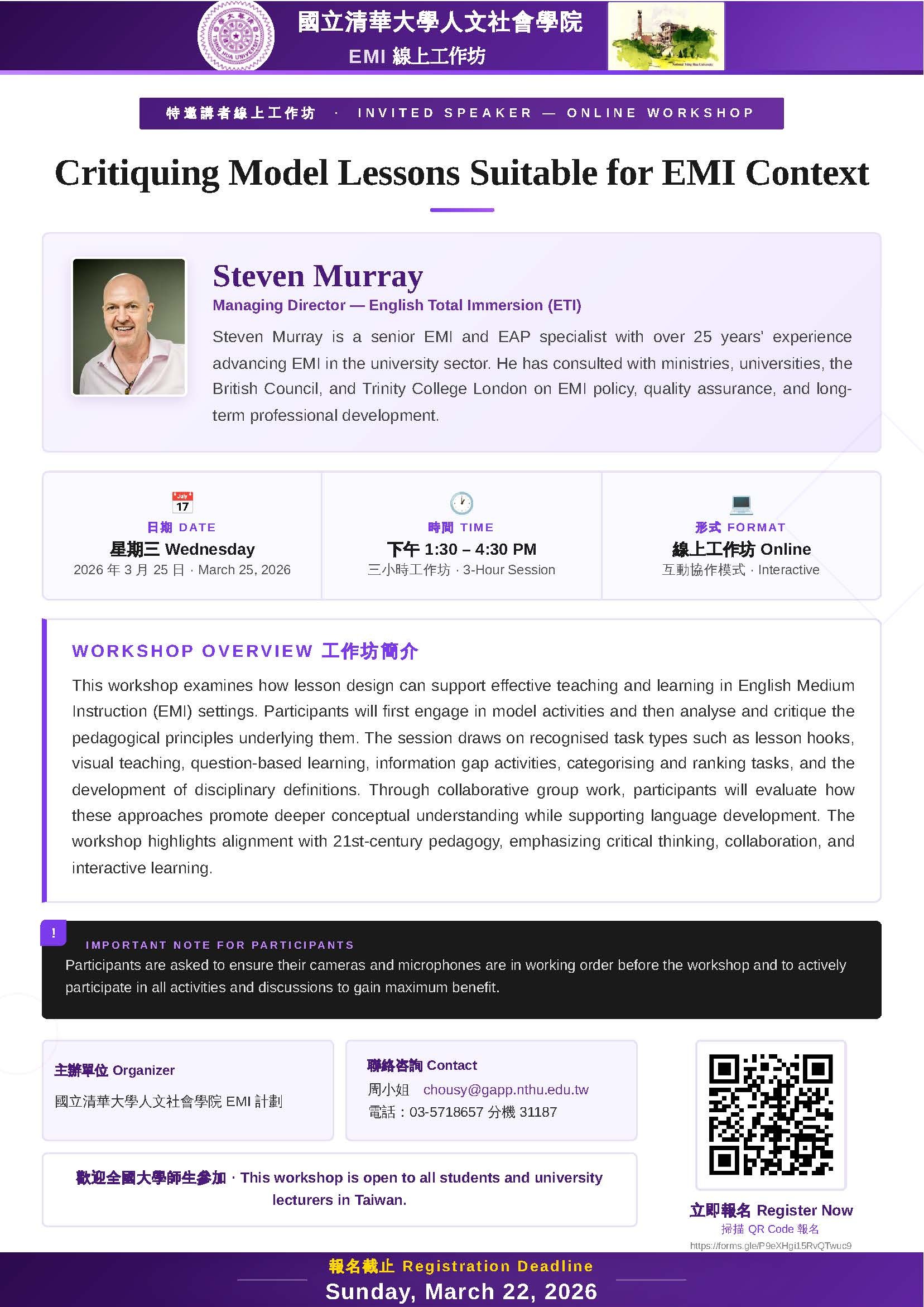 本次工作坊特邀 Steven Murray(Managing Director, English Total Immersion) 擔任講者,內容聚焦於 EMI 課程中教學活動設計與評析。本活動採互動式工作坊形式,參與者將實際參與教學活動體驗,並透過分組討論與交流,共同分析與回饋教學設計,適合有志於精進 EMI 教學之教師參與。