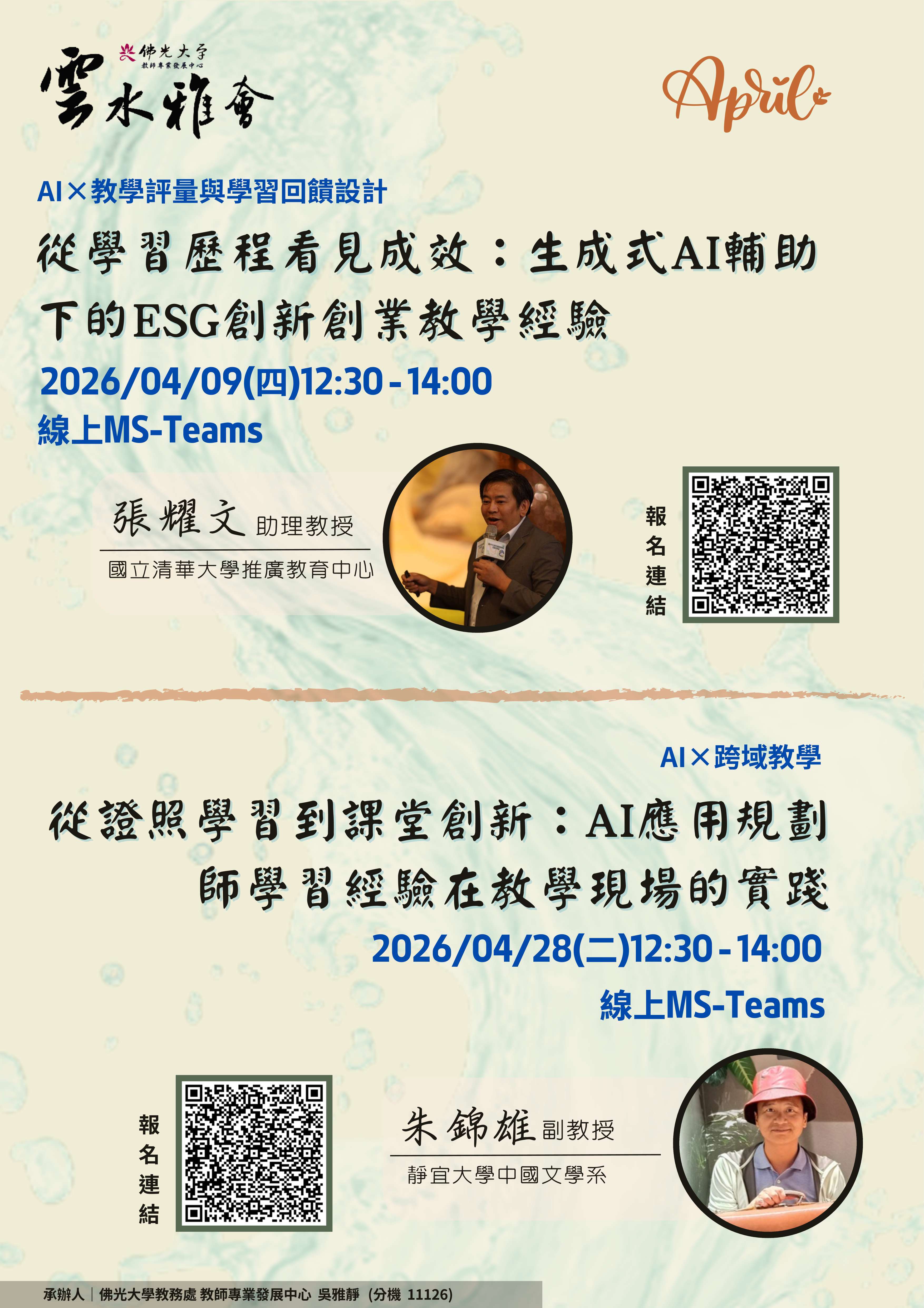 【教學實踐計畫校外活動】 115/4/9、4/28佛光大學教學實踐研究計畫東區基地辦理二場 「教師知能線上研習」
