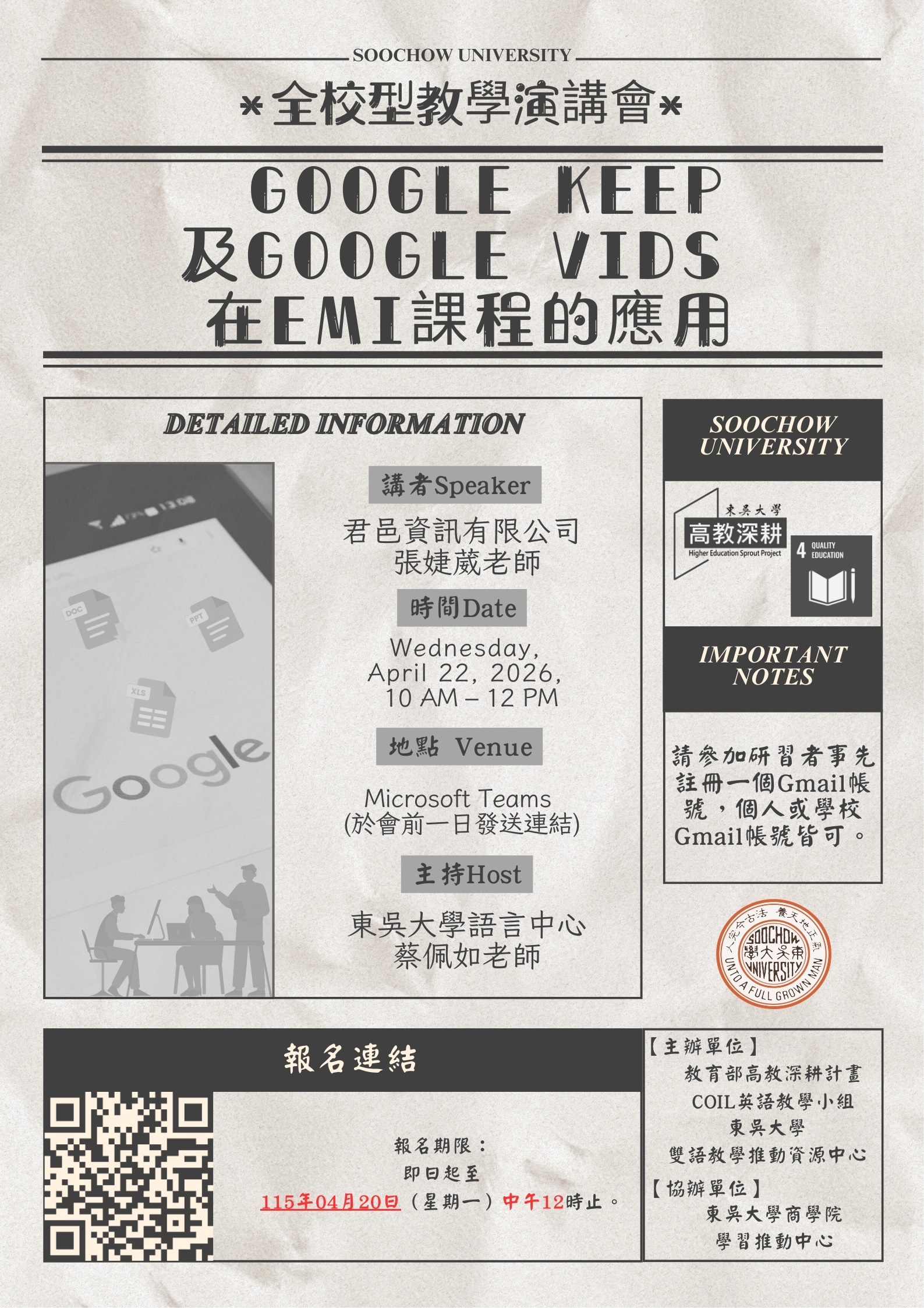 【EMI校外活動】115/4/22東吳大學雙語教學推動資源中心辦理「COIL英語教學小組-全校型演講會」活動相關訊息
