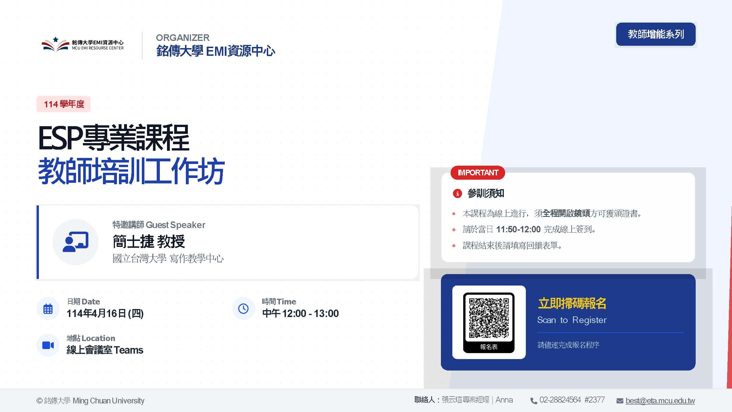 【EMI校外活動】115/4/16銘傳大學辦理ESP專業課程教師培訓工作坊